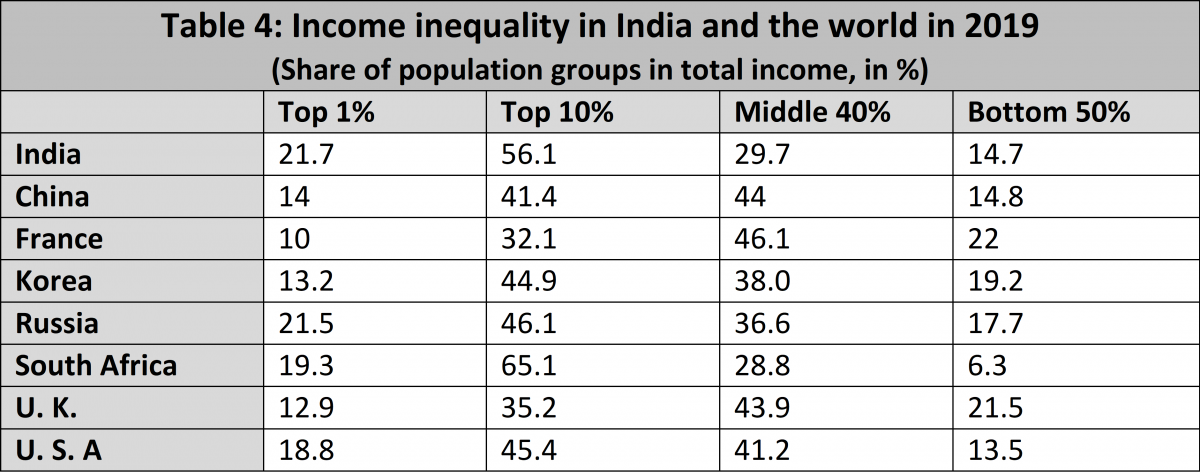 In terms of the gap between the top 1% and the bottom 50%, India stands apart among major economies (Table 4). The gap is wider in India than, for example, in the US, China, Russia, France, and the UK.