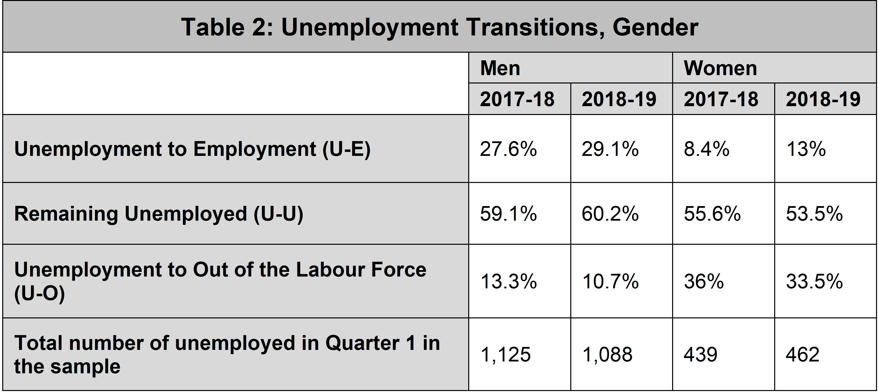 We disaggregate these estimates of unemployment transitions across two important demographic categories—gender and education. Table 2 displays unemployment transitions for men and women separately in both years, while Table 3 disaggregates these transitions by education. Individuals are divided into two categories based on their educational achievements—those who have received some amount of schooling, and those who have graduated from college (who include those with postgraduate levels of education). We do not include those without schooling because there are very few of these individuals among the unemployed.