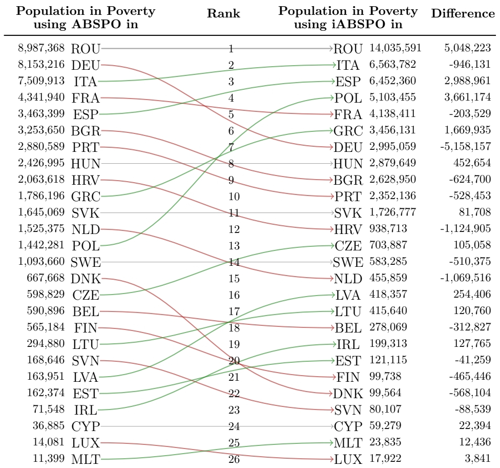 Figure 2 shows the differences in more detail. It illustrates both the impact of the dollar-a-day method on the ranking of the countries in terms of its population living in poverty, and the difference between the two estimates. Some countries see the population living in poverty change by a substantial percentage (e.g. -82.3% for Finland, -53% for Belgium, +56.4% for Romania) or a large absolute number (e.g Romania, Italy, Spain). On average, the absolute difference between the two estimates is slightly larger than 1 million people. In terms of poverty rates, the average difference is just a bit shy of 7 percentile points (while the average estimate is just 15%).