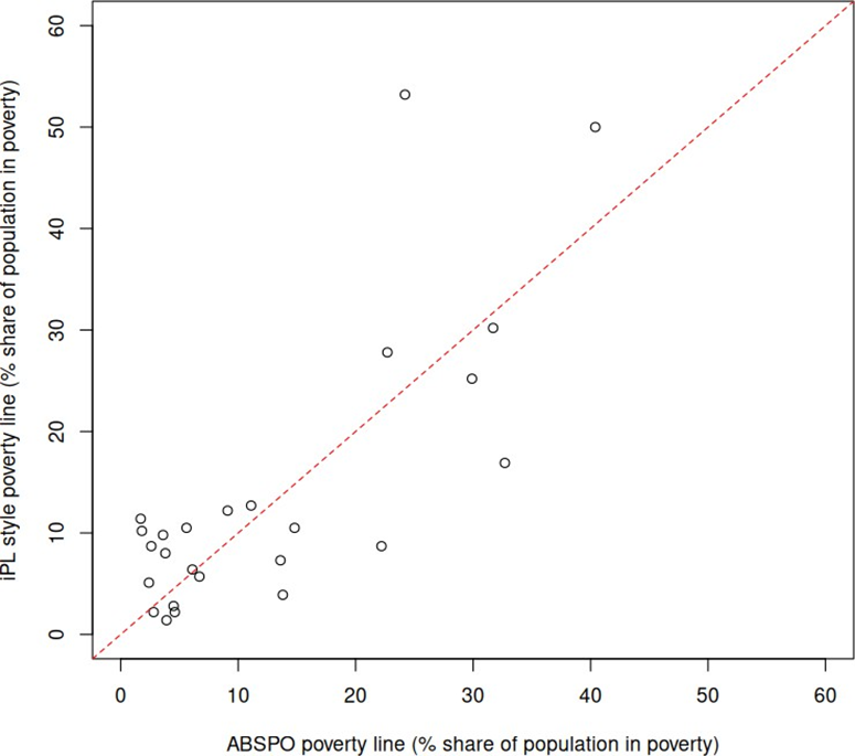 Recent research by the European Commission’s Joint Research Center (Menyhert et al., 2025; Menyhert, 2025) has shown that comparable poverty lines across EU member states that achieve comparable living standards vary considerably (in PPP terms). It can be easily shown (Figure 1) that the results would differ starkly per country should we use a single European poverty line instead, following the dollar-a-day method’s core idea. Figure 1 shows how large the differences are in terms of the actual country specific poverty line estimated by the EU’s Measuring and monitoring absolute poverty (ABSPO) project, against an iPL style poverty line across the entire group (such line has a value of $21.82/day in 2021 PPP dollars).