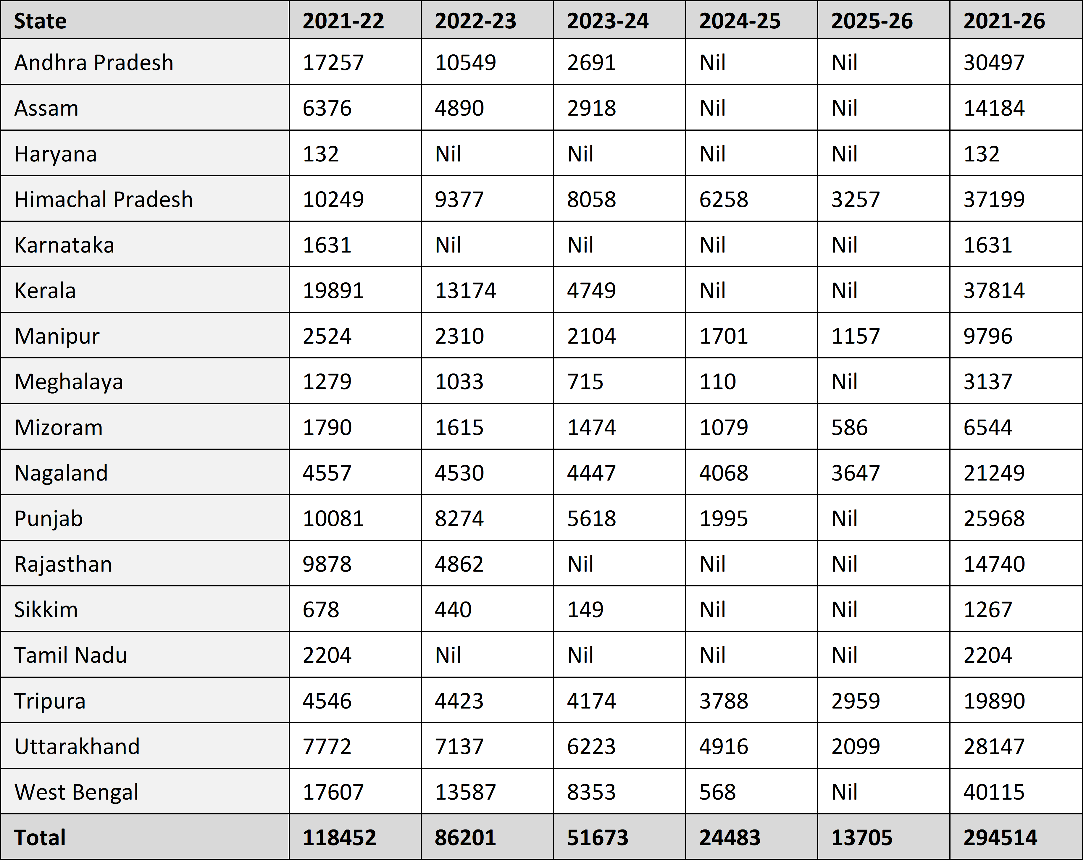 The RDGs, on the minimum, ensured deficit states came to a normatively assessed revenue balance. The 15th FC gave RDGs to 17 states in 2021-22, the first year of the award. By the final year, 2025-26, the number of states receiving RDGs were the six north-eastern and hill states. Table I gives the amounts and spread of the grant over the five years of the 15th FC period. As no specific assessment of the fiscal gap in each state has been done by the 16th FC, the impact can only be evident as the fiscal year 2026-27 unfolds. Can this be the reason that the Union government in its Action Taken Note 6Explanatory Memorandum as to the Action Taken on the Recommendations Made by the Sixteenth Finance Commission, February 2026, Ministry of Finance, Budget Division, Government of India. placed in Parliament kept its options open for assisting the states in fiscal distress by stating that “the Government takes note of the assessment of the Commission” instead of the usual “the Government accepts the recommendations”?