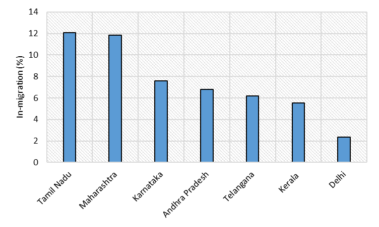 Among the major destination states, Tamil Nadu (12.1%), Maharashtra (11.8%), Karnataka (7.6%), Andhra Pradesh (6.8%), and Telangana (6.2%) account for the highest share of female in-migration for work. Southern urban centres such as Bengaluru and Chennai have emerged as key hubs for this emerging wave of female migrants, who are increasingly engaged in garment and textile factories, hospitality sectors, and also in domestic work and care giving.
