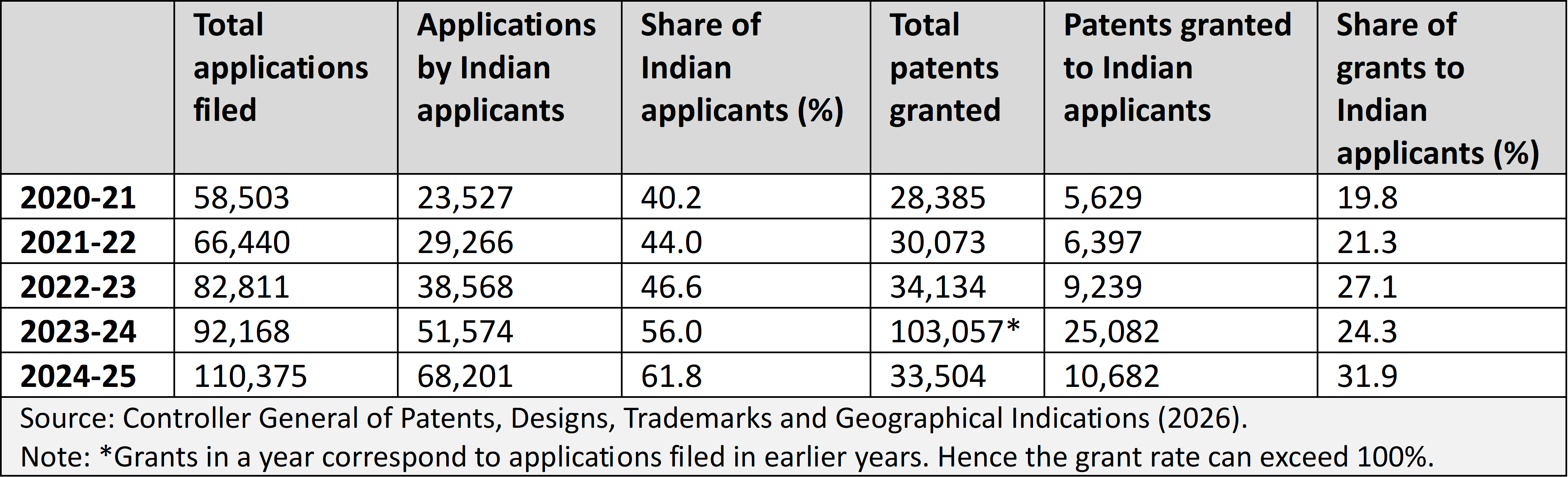 The Indian patent office experienced a historic surge in activity during the reporting period, with filings crossing the 100,000 milestone for the first time. A total of 110,375 patent applications were filed in 2024-25, a significant increase of 19.75% from the previous year (Controller General of Patents, Designs, Trademarks and Geographical Indications 2026). A key trend over the five-year period from 2020-21 to 2024-25 is the sustained and growing dominance of domestic innovation.
