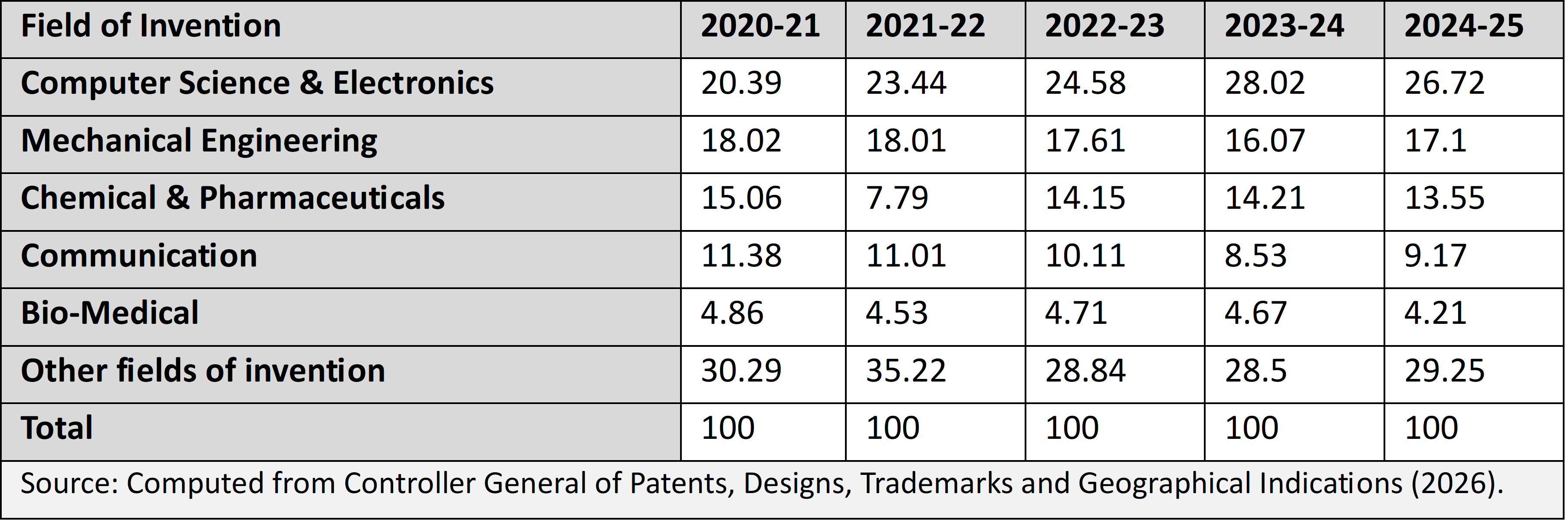 Table 2: Distribution of Patent Applications by Major Field of Invention, 2020-21 to 2024-25 (Percentage shares)