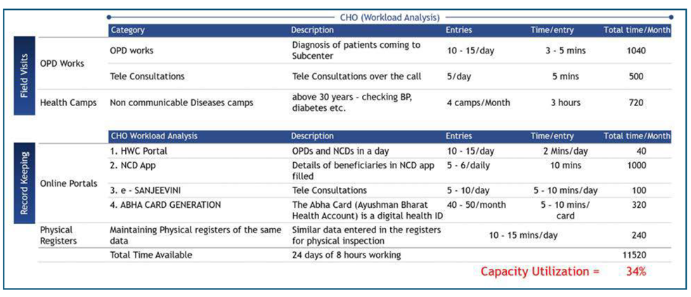 According to the study, CHOs are currently working at only 30–35% of their capacity, PHCOs at 90–100%, and Health Inspection Officers at 50–55%. The report recommended repurposing the CHO role by either posting them to primary health centres or assigning them additional data-entry work.