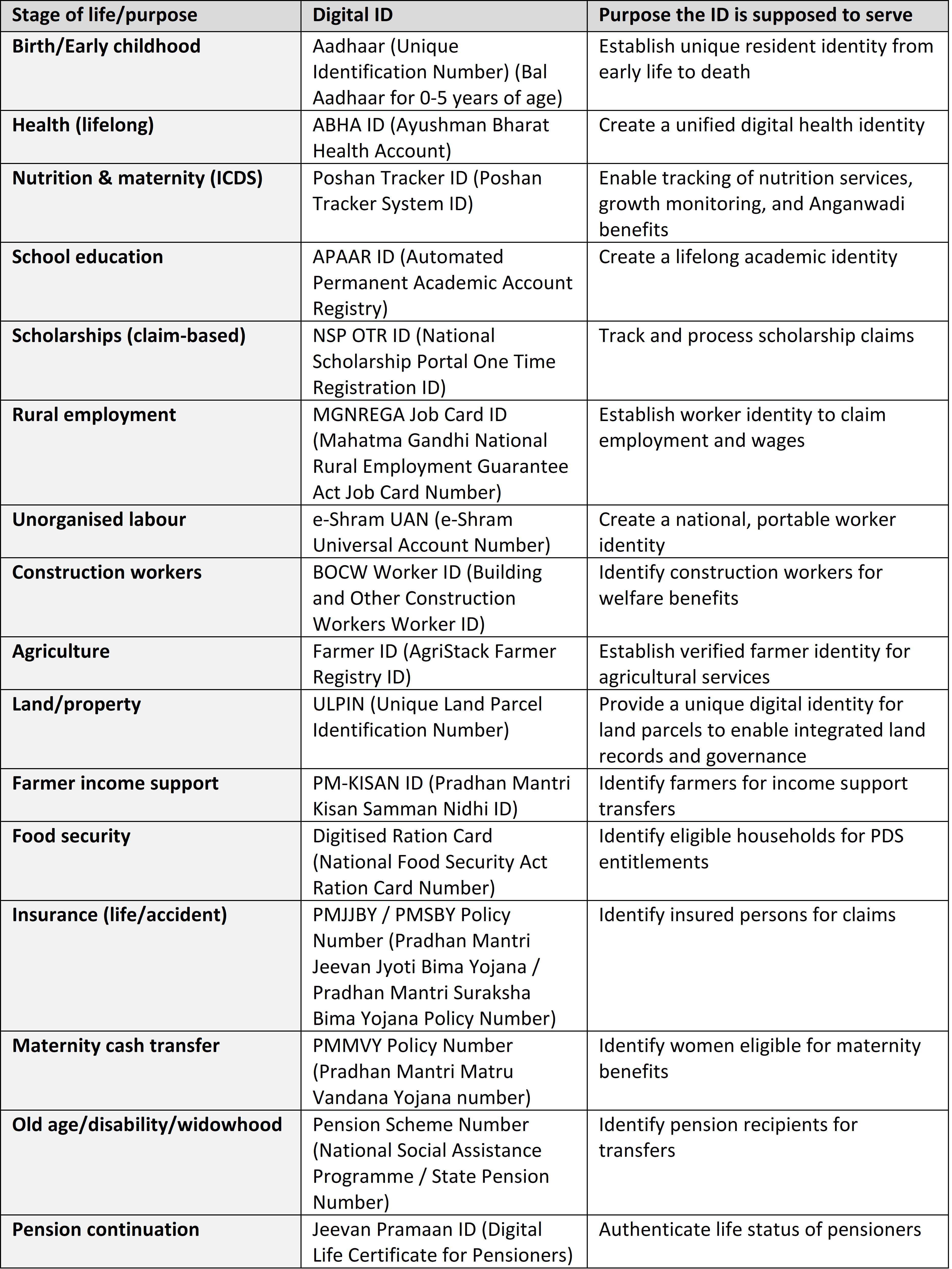 Table 1: Partial List of Digital IDs in Welfare