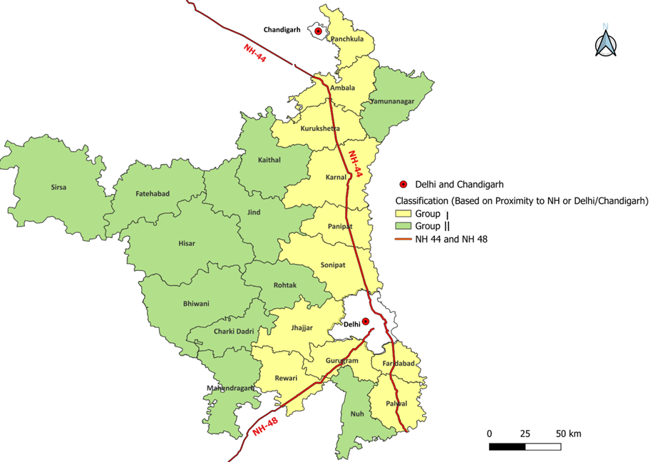 We group 22 districts into two clusters based on their proximity either to the two administrative hubs (New Delhi or Chandigarh) or to two major national highways (National Highway 44 and National Highway 48). 1National Highway 44, also known as the Grand Trunk Road, is the longest national highway. National Highway 48 is a part of the East-West corridor and the Golden Quadrilateral connecting mega cities and industrial clusters. Group I consists of 11 districts (Ambala, Faridabad, Gurugram, Karnal, Kurukshetra, Palwal, Panchkula, Panipat, Rewari, Sonipat, and Jhajjar) that are closer to one of these centres or highways. Group II includes the remaining districts (Bhiwani, Charkhi Dadri, Fatehabad, Hisar, Jind, Kaithal, Mahendragarh, Nuh, Rohtak, Sirsa, and Yamunanagar), which are farther away (Figure 1).