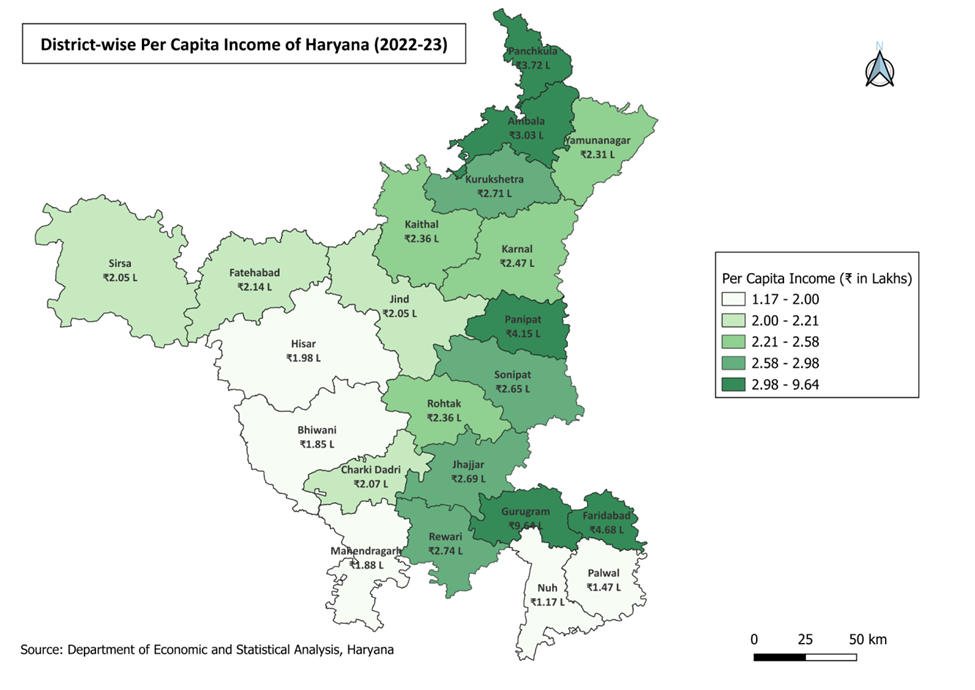 Anecdotal evidence on spatial patterns of economic development within Haryana suggests substantial variation in economic activity across districts. For example, Gurugram and Panipat are known for their thriving industrial ecosystems, in sharp contrast to districts such as Mahendragarh and Charkhi Dadri. A common explanation for these patterns points to proximity to major urban centres or national highways, which typically supports higher levels of economic activity (Ghani et al (2016), Partridge et al (2008), Lavesson(2017).