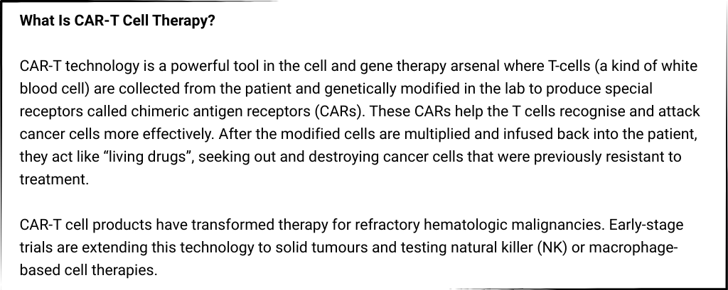 Beyond monogenic disorders, cell and gene therapies are reshaping cancer treatment as well. For example, CAR-T cell therapy is a type of personalised cancer treatment that uses the patient’s own immune cells to fight and kill the body’s cancerous cells (Box 2).