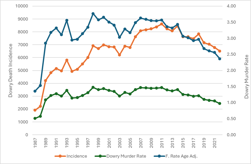 Figure 5: Incidence, Rate and Age-adjusted Rate of Dowry Murders, 1987 to 2022 (Per 100,000 population)